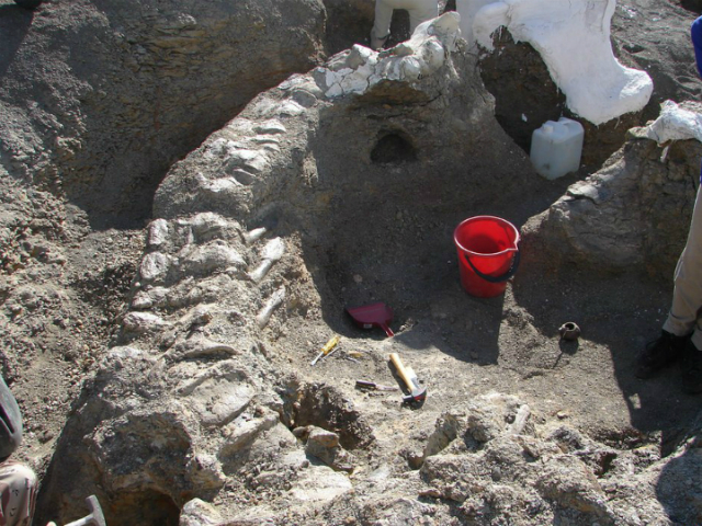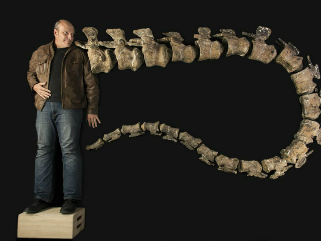 Ранее ещё мае 2014 года палеонтологи сообщили об обнаружении на территории Аргентины останков сверхмассивного динозавра. Возможно, он был одним из крупнейших существ, когда-либо живших на Земле. Опубликовав результаты исследования в начале сентября сего года ученные указали, что хорошо сохранившиеся кости невероятных размеров были раскопаны в южной Аргентине между 2005 и 2009 годом. Животное относится к роду титанозавров — длинношеих растительноядных динозавров-зауроподов. Существо окрестили Dreadnoughtus schrani. Название рода, Dreadnoughtus, восходит к староанглийскому слову "бесстрашный", и оно было дано гиганту в честь дредноутов — огромных кораблей начала XX века. Исследователи предположили, что взрослое существо вырастало до настолько больших размеров, что, скорее всего, было непроницаемо для атаки хищников. ![]() Кеннет Лаковара и девятиметровый хвост Dreadnoughtus schrani (фото Robert Clark, Excel Magazine,Drexel University). Видовое название schrani дано в честь американского предпринимателя Адама Шрэна (Adam Schran) за его поддержку проекта палеонтологических исследований. Исследование было возглавлено Кеннетом Лаковарой (Kenneth Lacovara), специалистом по палеонтологии позвоночных из университета Дрекселя в Филадельфии (штат Пенсильвания, США). Кости двух особей были обнаружены в отложениях в полупустыне в Патагонии и датируются периодом от 66 до 84 миллионов лет назад. "Было восстановлено около 45% костей тела, череп не сохранился, – рассказывает Лаковара. – Если использовать зеркальные изображения костей, присутствующих на одной стороне существа, то можно провести реконструкцию 70% костей этого вида, включая шейные кости, а также кости туловища и хвоста". ![]() Девятиметровый хвост ящера-корабля (фото K. Lacovara). Исследовав кости и использовав пропорции близких родственников вида, Лаковара и его коллеги пришли к выводу, что длина Dreadnoughtus составляла около 26 метров от морды до хвоста. ![]() Измерив окружности плечевой и бедренной костей, признанных стандартом для оценки массы тела четвероногих, команда пришла к выводу, что наибольший из останков весил около 59,3 тонны на момент своей смерти. То есть, по сути, существо было вдвое больше тираннозавра и тяжёлым, как стадо слонов. Это ставит его в один ряд с другими известными гигантами, например, аргентинозавром (Argentinosaurus). Динозавр-дредноут был в четыре раза тяжелее, чем хорошо известный диплодок. ![]() Локация раскопок в Патагонии (фото K. Lacovara). Отличительной чертой аргентинского гиганта была длинная шея, а также оснащённый шипами мускулистый хвост и сильные задние ноги с тремя мощными когтями. Правда, так как животное было травоядным, а калорий для поддержания такого организма требуется великое множество, скорее всего, оно проводило весь свой день, стоя на месте и пожирая листья деревьев и папоротников. Предположительно, обитали эти существа на территории современной Латинской Америки. ![]() Хотя некоторые другие титанозавры, по оценкам, весили около сотни тонн, эти цифры основаны на менее точных методах экстраполяции ископаемых (часто гораздо более фрагментированных), отмечают палеонтологи. ![]() Динозавр-дредноут в сравнении с человеком (иллюстрация Emily M. Eng, NG Staff Source: Matthew C. Lamanna, Carnegie Museum of Natural History). Поэтому, скорее всего, Dreadnoughtus является крупнейшим известным науке сухопутным созданием, масса тела которого может быть точно рассчитана. Кроме то
