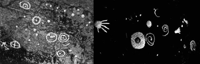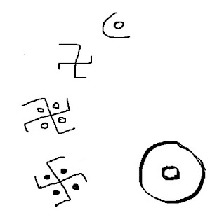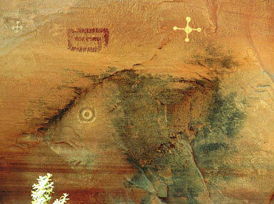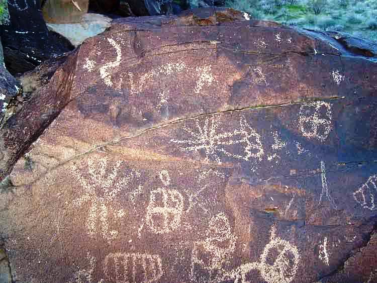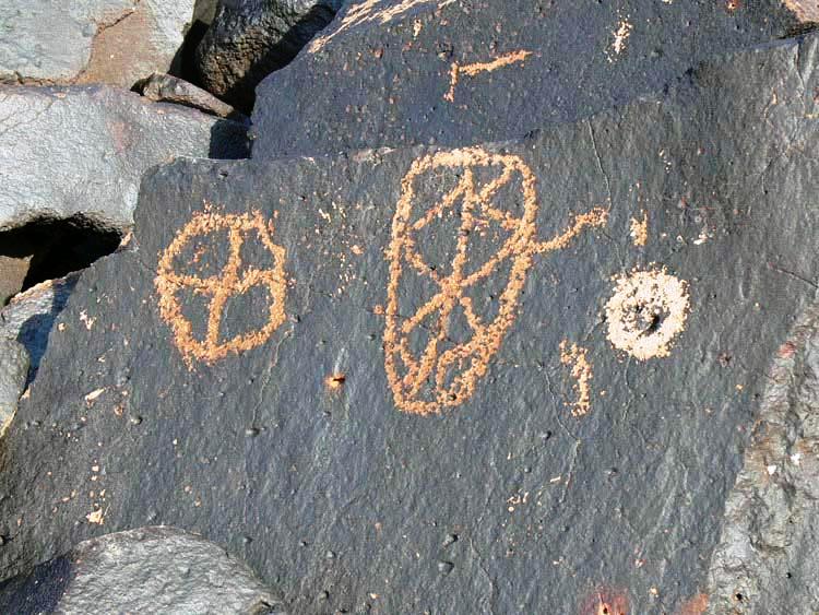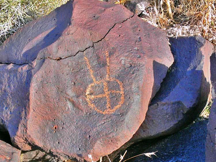 Крест - звезда и Солнце. Перемычка между светилами - перетекание вещества от Солнца к звезде. Петроглиф. Невада.