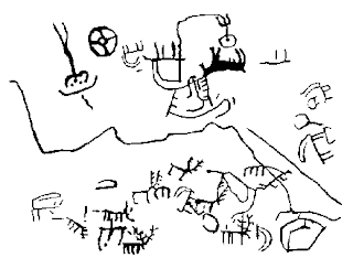 контуры гор и рисунки животных. Крест - звезда на фоне гор. Справа созвездие Козерог и Большая Медведица. Петроглиф. Армения. Ухтасар. Крест-солнце (вверху) и Солнце. Перемычка между звездами - гигантский протуберанец, который возник при максимальном сближении Солнца и звезды. Ниже показана газопылевое облако оставшееся в результате этого "небесного сражения". На одном из петроглифов имеется