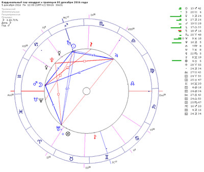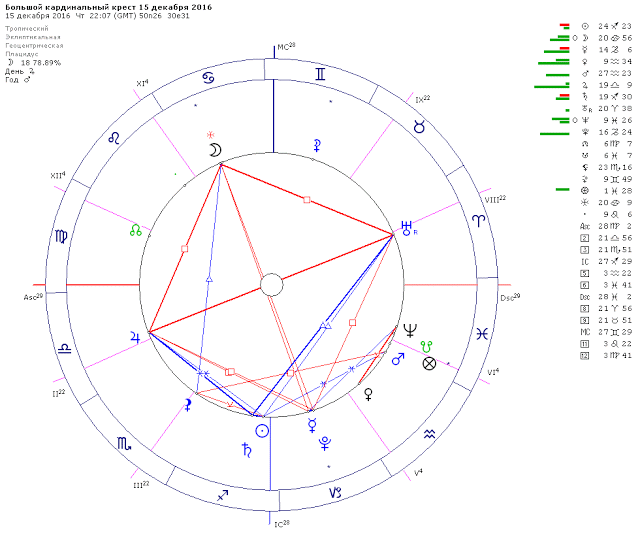 Общий прогноз на месяц – это описание текущей транзитной ситуации без привязки к конкретному гороскопу, поэтому этот прогноз носит общий характер. О том, какое влияние данный период оказывает лично на Вас, можно узнать на консультации по индивидуальному гороскопу. Но независимо от личного гороскопа, эти рекомендации помогут Вам эффективнее использовать планетные энергии месяца. Ретроградные планеты ® в декабре 2016 Уран ретроградный до 29 декабря Меркурий станет ретроградным с 19 декабря Остальные планеты движутся директно Фоновые аспекты месяца: Секстиль Юпитера с Сатурном весь месяц Трин Сатурна с Ураном весь месяц Квадрат Юпитер-Плутон весь месяц Стеллиум в Стрельце до 02 декабря Стеллиум в Козероге 03-07 декабря, 21 декабря-04 января Оппозиция Юпитера с Ураном 24 ноября-18 апреля 2017 Тау-квадрат: Юпитер-Плутон-Уран 24 ноября-18 апреля 2017 Секстиль Марса с Юпитером до 14 декабря Бисекстиль: Марс-Юпитер-Сатурн до 14 декабря Трапеция: Марс-Юпитер-Уран-Сатурн 30 ноября-14 декабря Трапеция: Венера-Юпитер-Уран-Сатурн 20-30 декабря Тау-квадрат: Меркурий/Плутон-Уран-Юпитер 12-24 декабря Периоды неэффективности Луны В периоды, когда Луна уже сделала свой последний мажорный аспект, но еще не перешла в следующий знак, нужно избегать запуска новых проектов и любых других дел, рассчитанных на перспективу и развитие. Это так называемая «Луна без курса» или периоды неэффективности Луны. Лучшая стратегия в это время – ничего не предпринимать, оставить всё как есть, пока Луна не войдёт в следующий знак. Узнать больше о том, как можно использовать это время себе во благо можно здесь. Расписание «Луны без курса» на 2016 год смотрите здесь. А ниже таблица на месяц – даты и время периодов «Луны без курса».Время по Гринвичу – GMT. Для Киева прибавляем +2, для Москвы +3. 01.12.2016 04:09 - 01.12.2016 08:53 03.12.2016 10:17 - 03.12.2016 19:45 05.12.2016 11:24 - 06.12.2016 04:31 07.12.2016 14:06 - 08.12.2016 10:17 10.12.2016 01:07 - 10.12.2016 12:41 12.12.2016 04:06 - 12.12.2016 12:42 14.12.2016 05:59 - 14.12.2016 12:10 15.12.2016 21:38 - 16.12.2016 13:16 18.12.2016 16:56 - 18.12.2016 17:53 21.12.2016 01:57 - 21.12.2016 02:41 22.12.2016 19:33 - 23.12.2016 14:34 25.12.2016 07:23 - 26.12.2016 03:20 28.12.2016 01:46 - 28.12.2016 15:13 30.12.2016 08:08 - 31.12.2016 01:30 Основные астрособытия месяца Дата Аспект GMT Фазы, градусы 01 декабря Солнце в квадратуре с Нептуном 01:16 02 декабря Марс в трине с Юпитером 03:44 02 декабря ингрессия (переход) Меркурия в Козерог 21:19 03 декабря Марс в трине с Сатурном 12:14 07 декабря Марс в секстиле с Ураном 03:29 07 декабря первая четверть Луны 09:04 15°42' Рыб 07 декабря ингрессия (переход) Венеры в Водолей 14:52 09 декабря Марс в квадратуре с Чёрной Луной 12:17 09 декабря Солнце в секстиле к Юпитеру 21:38 10 декабря Меркурий в секстиле к Нептуну 08:35 10 декабря Солнце в соединении с Сатурном 11:50 12 декабря Луна в оппозиции с Чёрной Луной 01:21 12 декабря Солнце в трине к Урану 06:56 14 декабря полнолуние 00:07 22°26' Близнецов 19 декабря ингрессия (переход) Марса в Рыбы 09:24 19 декабря Меркурий становится ретроградным ® 10:49 15°06' Козерога – R 21 декабря последняя четверть Луны 01:57 29°38' Девы 21 декабря ингрессия (переход) Солнца в Козерог 10:45 25 декабря Сатурн в трине с Ураном 00:18 25 декабря Венера в трине с Юпитером 13:22 25 декабря Венера в секстиле с Ураном 16:35 25 декабря Луна в соединении с Чёрной Луной 15:55 25 декабря Венера в секстиле с Сатурном 18:32 26 декабря Юпитер в оппозиции с Ураном 18:33 27 декабря Меркурий в секстиле с Нептуном 04:12 27 декабря Солнце в секстиле с Марсом 08:07 28 декабря Солнце в соединении с ретро-Меркурией 18:46 28 декабря рет