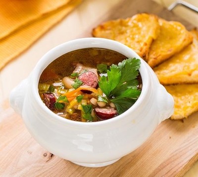 Понадобится: 300 г копченой колбасы, 200 г копченой грудинки, 1 стебель лука-порея, 1 морковь, 2 зубчика чеснока, 4 помидора, 3 ст. ложки растительного масла, 2 л мясного бульона, 200 г белой консервированной фасоли, 2 веточки петрушки, 4 куска хлеба для тостов, 150 г тертого сыра, соль, молотый черный перец. Приготовление: Копченую колбасу и грудинку нарезать ломтиками. Стебель лука-порея вымыть и нарезать колечками, морковь – соломкой. Чеснок порубить, помидоры нарезать дольками. В кастрюле разогреть масло и обжарить морковь. Добавить порей, чеснок и подрумянить все вместе. Положить колбасу и грудинку, жарить 5 минут. Добавить помидоры, посолить, поперчить, перемешать и тушить под крышкой 7 минут. Затем влить мясной бульон и довести до кипения. Добавить фасоль, немного посолить и варить 5 минут. Петрушку вымыть, обсушить и порубить. Ломтики хлеба посыпать сыром и быстро запечь в духовке. Суп разлить по тарелкам, посыпать зеленью и подать с тостами с сыром. |