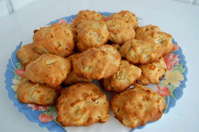 Ингредиенты: 500 гр муки 200 гр маргарина 120 гр сахара 3 яблока 4 яйца 1 пакетик ванилина 1 пакетик разрыхлителя Сахарная пудра — для обсыпки Рецепт приготовления яблочного печенья: Сперва яйца растираем с сахаром и ванилином, добавляем растопленный маргарин и перемешиваем. Затем добавляем муку, смешанную с разрыхлителем, и вымешиваем ложкой тесто. Яблоки чистим, режем мелкими кубиками и добавляем в тесто. Выкладываем столовой ложкой небольшие горки на листы, застеленные бумагой для выпечки, и выпекаем в разогретой до 200 градусов духовке до золотистого цвета, буквально 10-15 минут. После выпечки обсыпаем печенье сахарной пудрой. Приятного аппетита! |