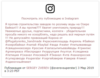 Собственник строящегося завода в поселке Култук Иркутской области — ООО «Аквасиб». Компания зарегистрирована в Иркутске, но ее основным владельцем является Дацинская водная компания «Озеро Байкал» из Китая. Реализацию проекта начали в 2013 году. Первую очередь завода должны были ввести в эксплуатацию в конце 2019 года, полностью запустить завод в 2021 году. Общий объем инвестиций составляет около 1,5 миллиарда рублей. Полная проектная мощность предприятия — 528 тысяч литров воды в сутки или 190 миллионов литров в год. По данным «Аквасиба», на экспорт пойдет 80% продукции, остальные 20% — на российский рынок. В 2019 году вокруг завода поднялся шум, дошедший до высшего руководства страны. Со срочными проверкам на стройку пришла прокуратура, в Иркутской области начались митинги и пикеты. Итог — 15 марта Кировский районный суд Иркутска вынес решении о приостановке работ до полного устранения нарушений. ![]() Наблюдатели, знакомые с ситуацией, утверждают, что возмущенных жителей прибрежной зоны Иркутска недостаточно информировали, а где-то откровенно обманули, и за широким общественным резонансом стоит конкурирующий бизнес, отстаивающий только свои финансовые интересы. Что нарушили строители завода Тщательные проверки строящегося завода начались после того, как тревогу забили общественники и местные жители: в поселке Култук митингующие установили баннер с фотографией Рамзана Кадырова и надписью «Рамзан, спаси Байкал!». От власти одним из первых на возможные нарушения при строительстве завода обратил внимание депутат госдумы от Бурятии, член комитета российского парламента по экологии Николай Будуев. Он написал запрос в Байкальскую природоохранную прокуратуру, отметив, что добыча воды не нанесет ущерба озеру, в отличие от строительства завода. Правда, беспокойства местного населения были связаны не озером, а больше с собственным комфортом. «Жители Култука, которые живут на особо охраняемой природной территории и, простите, туалет без разрешения построить не могут, озабочены, не ухудшит ли их положение санитарно-защитная зона, которая появится вокруг завода», — написал Будуев на своей странице в Facebook. Его коллега депутат Госдумы и председатель парламентского комитета по экологии и охране окружающей среды Владимир Бурматов направил похожее обращение в Генпрокуратуру России. ![]() В ходе проверок природоохранное ведомство, а также прокуратура обнаружили возле строящегося завода следы нефтепродуктов и отходы производства на берегу озера. Кроме того, собственник не предоставил проверяющим документы, разрешающие проводить земляные работы для обустройства траншей под водоводы, общественные слушания по строительству этого завода также провели с нарушениями. Права птиц и звезды Природоохранная прокуратура, начав проверку, почти сразу обратила внимание собственников на то, что стройка затрагивает болота, где останавливаются редкие птицы. Волновались за судьбу птиц и ученые. Иркутский орнитолог Виталий Рябцев сообщил, что на эти болота прилетают лебедь-крикун, разнообразные виды уток, черный аист и серый журавль. Однако компания-собственник «АкваСиб» заверила, что после завершения строительства восстановит экосистему болот, так как эта процедура изначально предусмотрена в проекте. По словам ведущего научного сотрудника Геологич