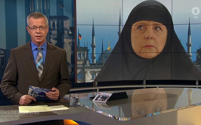 В качестве иллюстрации к репортажу о квоте на мигрантов телеканал ADR показал пародийное изображение канцлера ФРГ Ангелы Меркель в хиджабе на фоне Рейхстага, окруженного минаретами мечетей.